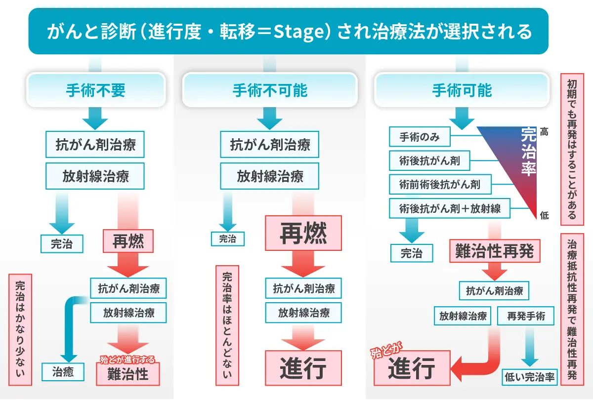 医師により「がん」と診断された場合、病期(ステージ)に応じてガイドラインに沿った標準治療が行われます。標準治療には、手術・抗がん剤(化学療法)・放射線治療があります。